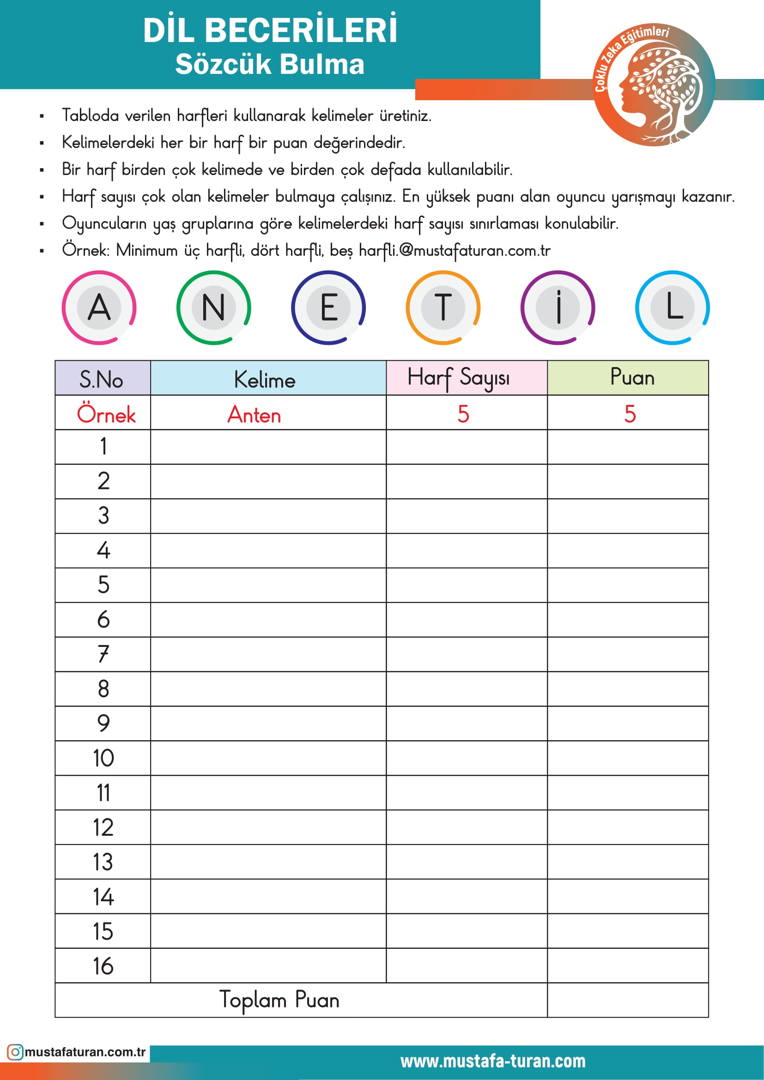 Çocuklarımızın dil gelişimlerine katkıda bulunmak ve kelime (sözcük ) dağırcıklarını ölçmek amacıyla hazırladığımız dil kelime bilgisi etkinlik çalışmaları. BİLSEM' e Giricek Öğrencilerimizin dil ve kelime bilgilerini geliştirmek amacıyla oyun tarzında hazırladığımız çalışmalar... BİLSEM Sözel - Dil ve Kelime Bilgisi Etkinlikleri. Evde aile içerisinde veya sınıf ortamamında grup içi oyun olarak oynanabilir.