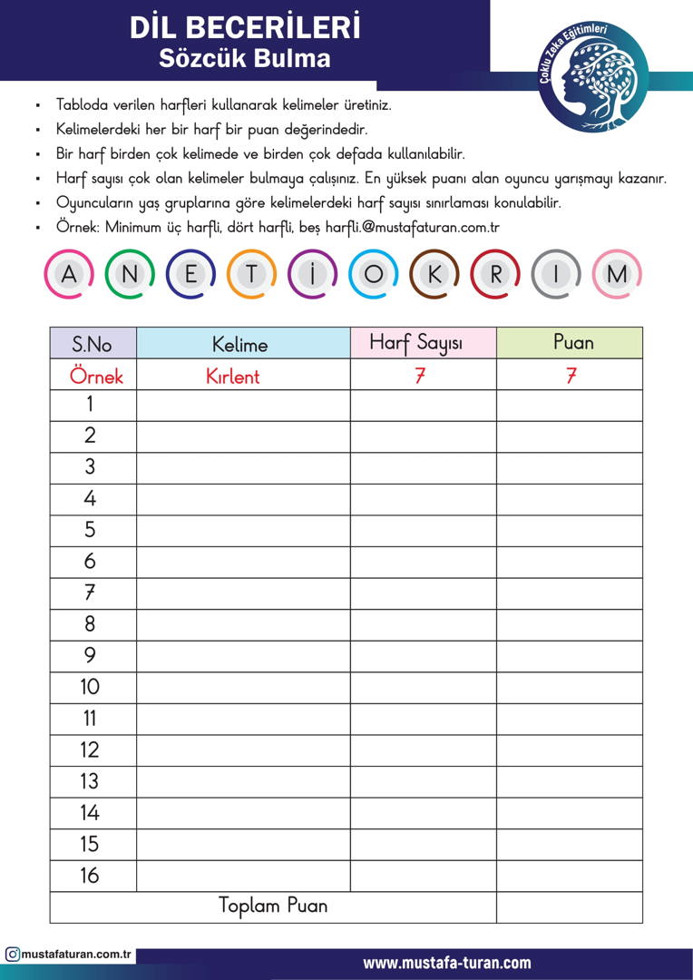 Çocuklarımızın dil gelişimlerine katkıda bulunmak ve kelime (sözcük ) dağırcıklarını ölçmek amacıyla hazırladığımız dil kelime bilgisi etkinlik çalışmaları. BİLSEM' e Giricek Öğrencilerimizin dil ve kelime bilgilerini geliştirmek amacıyla oyun tarzında hazırladığımız çalışmalar... BİLSEM Sözel - Dil ve Kelime Bilgisi Etkinlikleri. Evde aile içerisinde veya sınıf ortamamında grup içi oyun olarak oynanabilir.