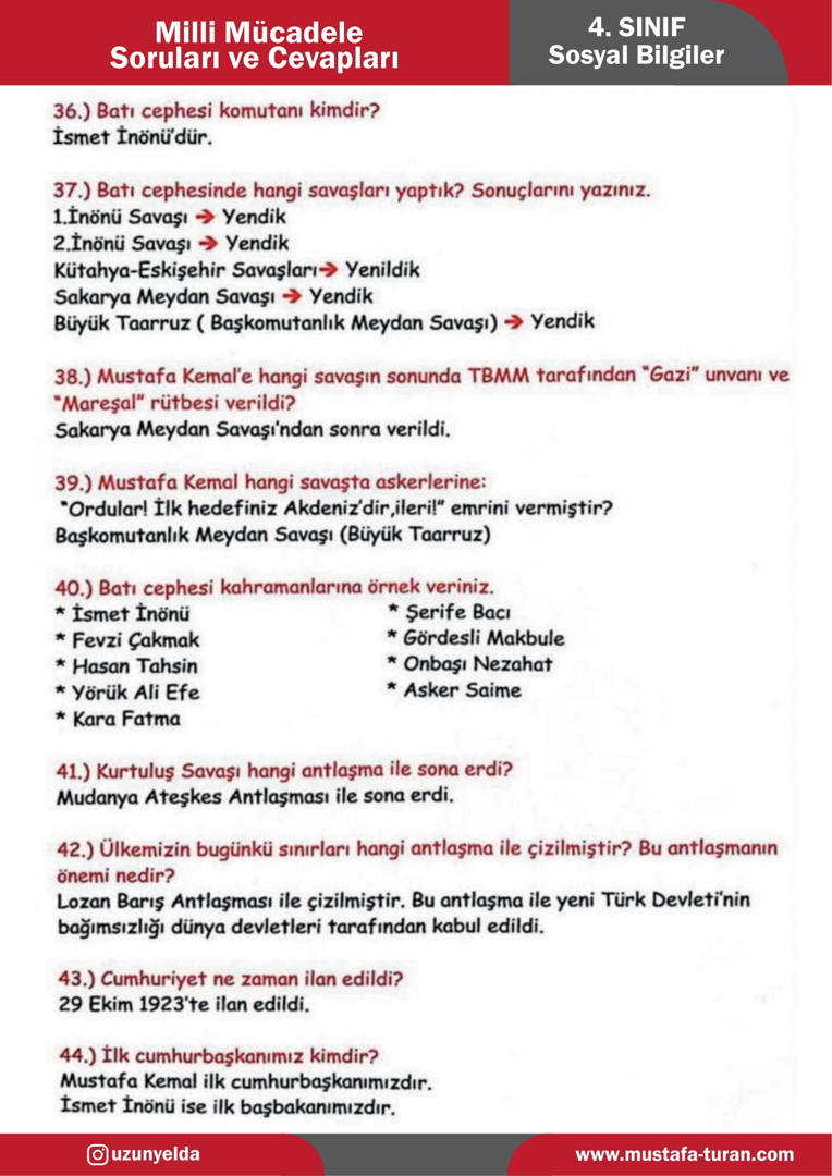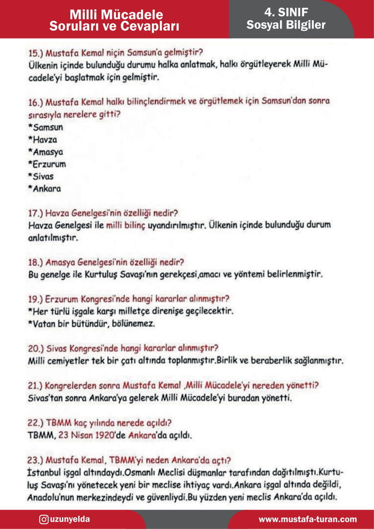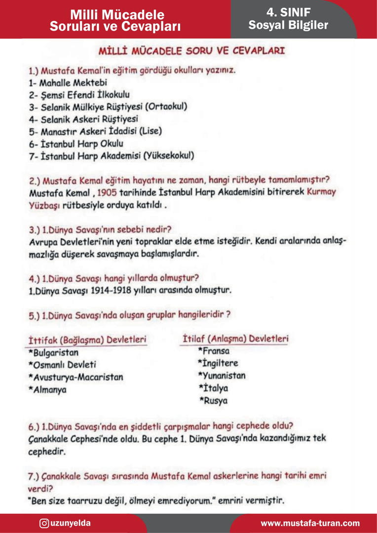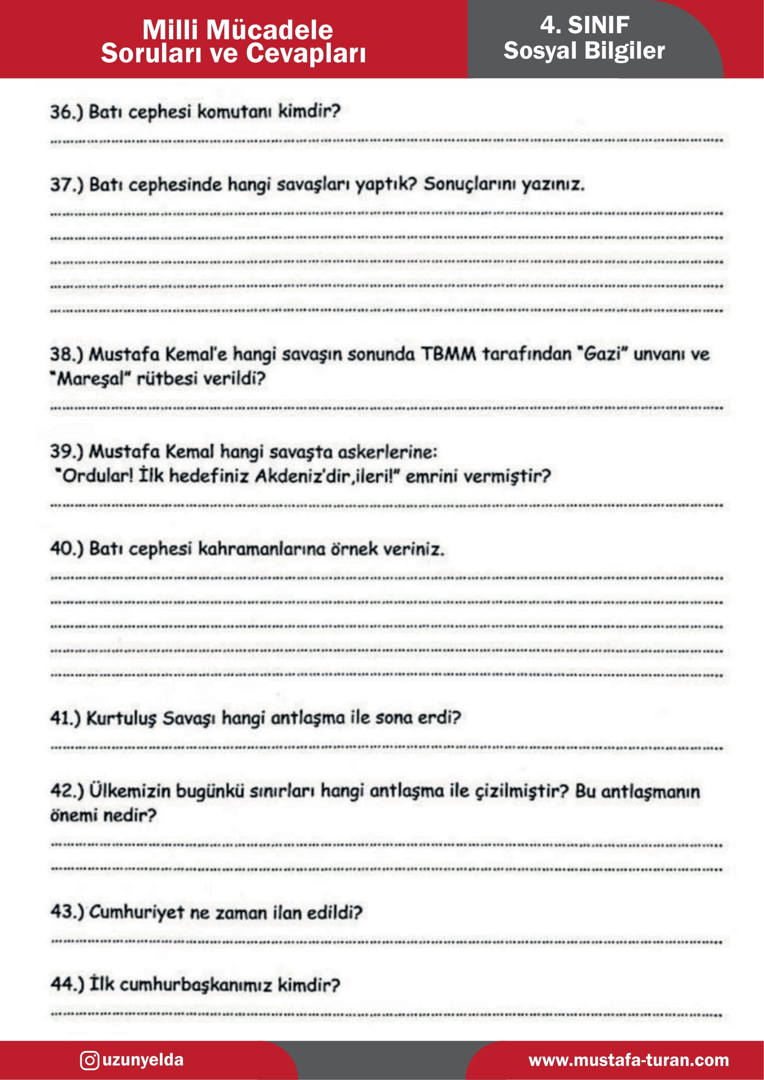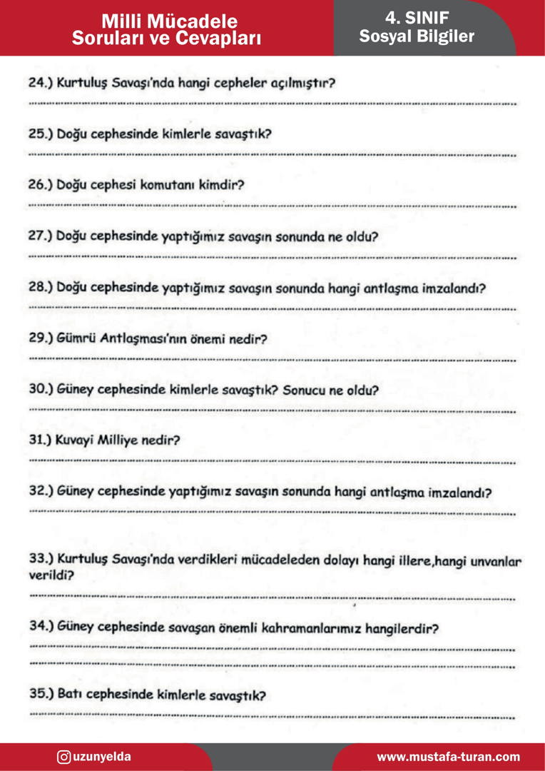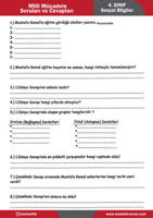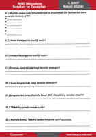 4. Sınıf Sosyal Bilgiler Dersi Milli Mücadele Soru Etkinlikleri
