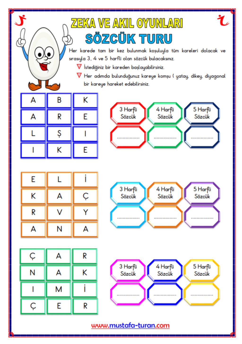 Word Tour 1st Level Word Tour Activities Series in the Mind and Intelligence Games Category You will fill in all the squares and find words with 3, 4 and 5 letters respectively, provided that you appear in each square exactly once. You can start from any square you want. With each step, you can move to a square (horizontal, vertical, diagonal) adjacent to the current square.