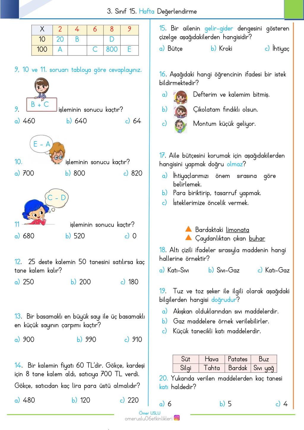3. Sınıf 15. Hafta Değerlendirme Sınavı