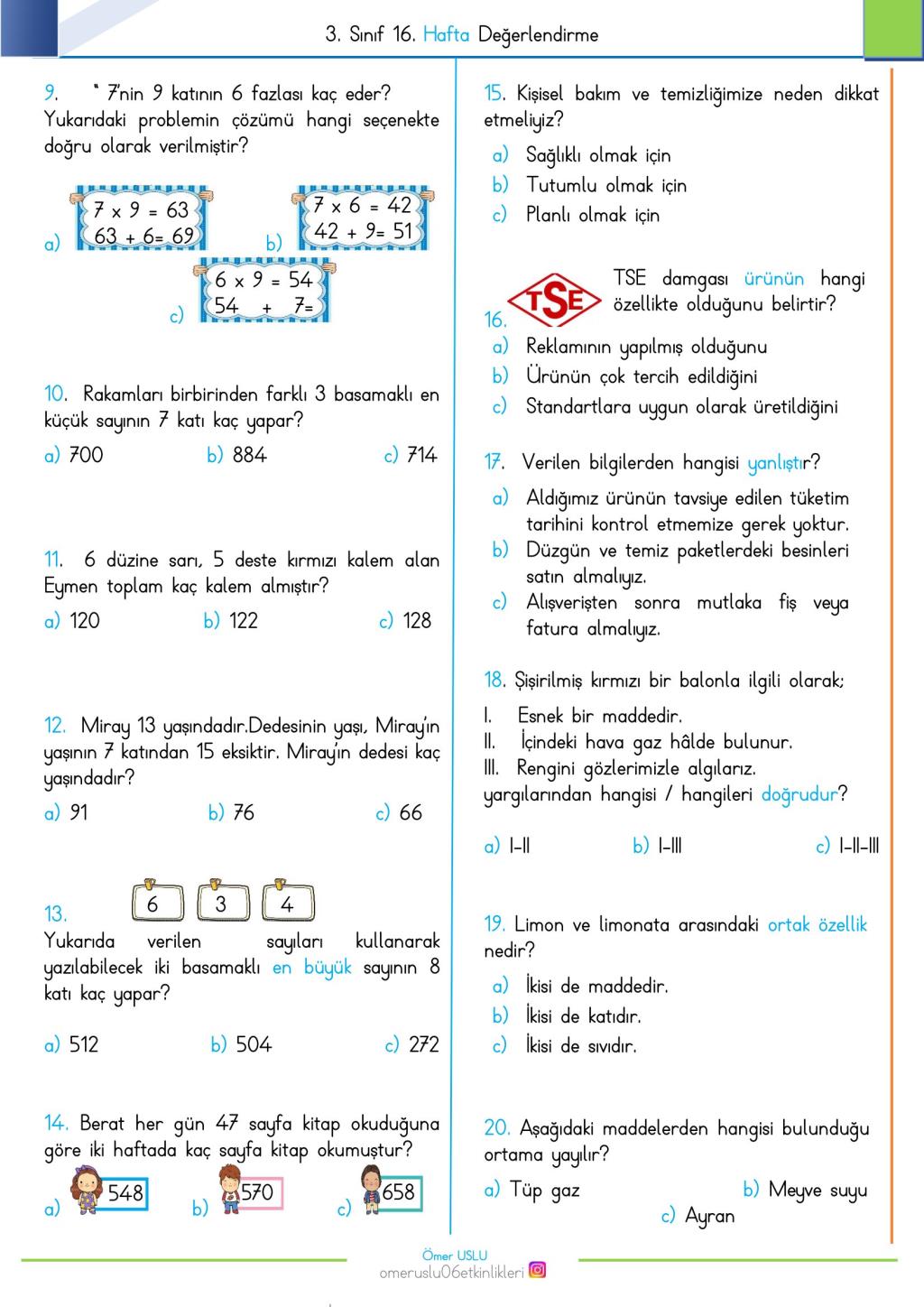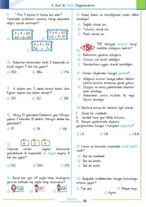 3. Sınıf 16. Hafta Değerlendirme Sınavı