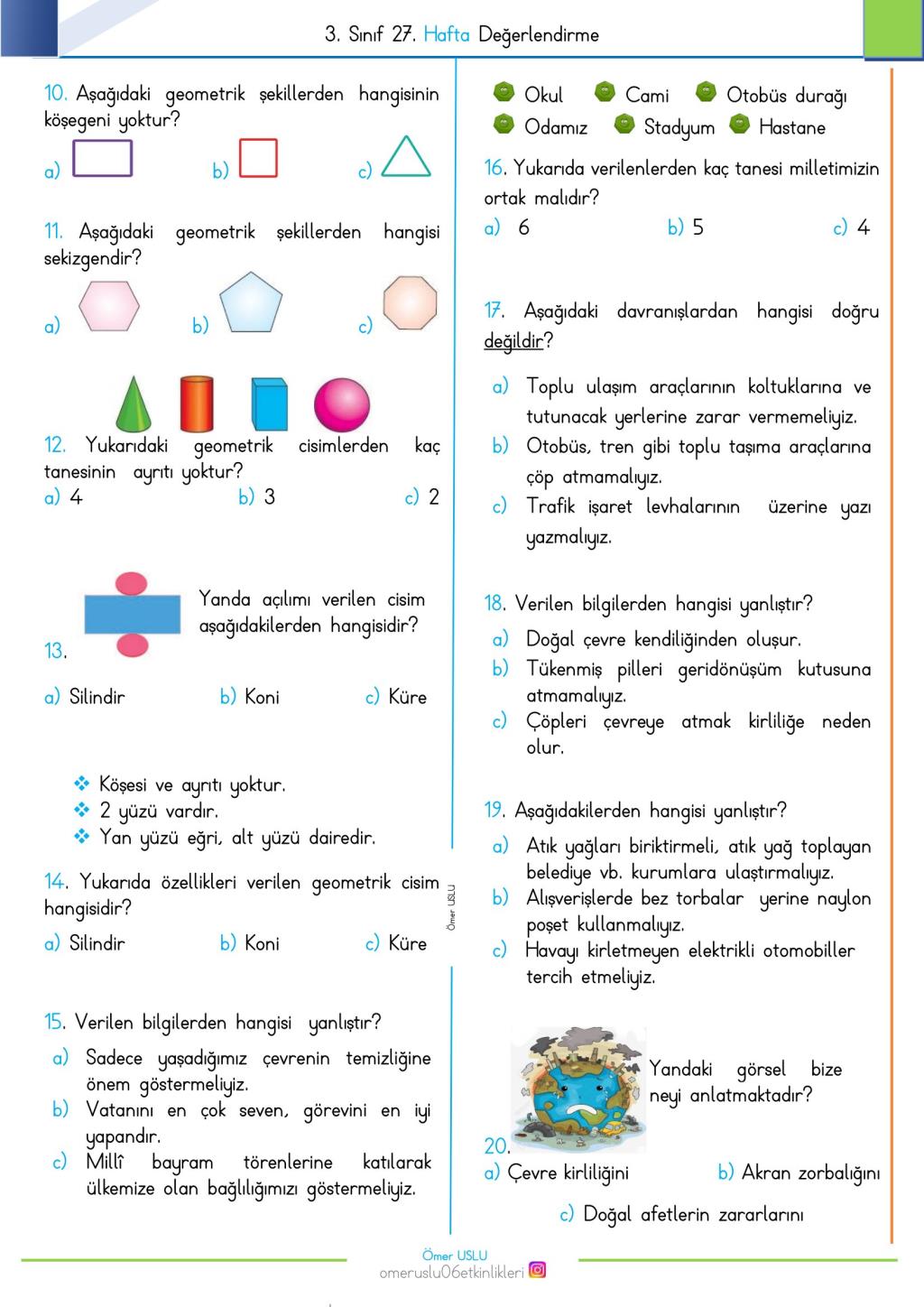 3. Sınıf 27. Hafta Değerlendirme Sınavı