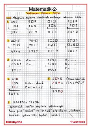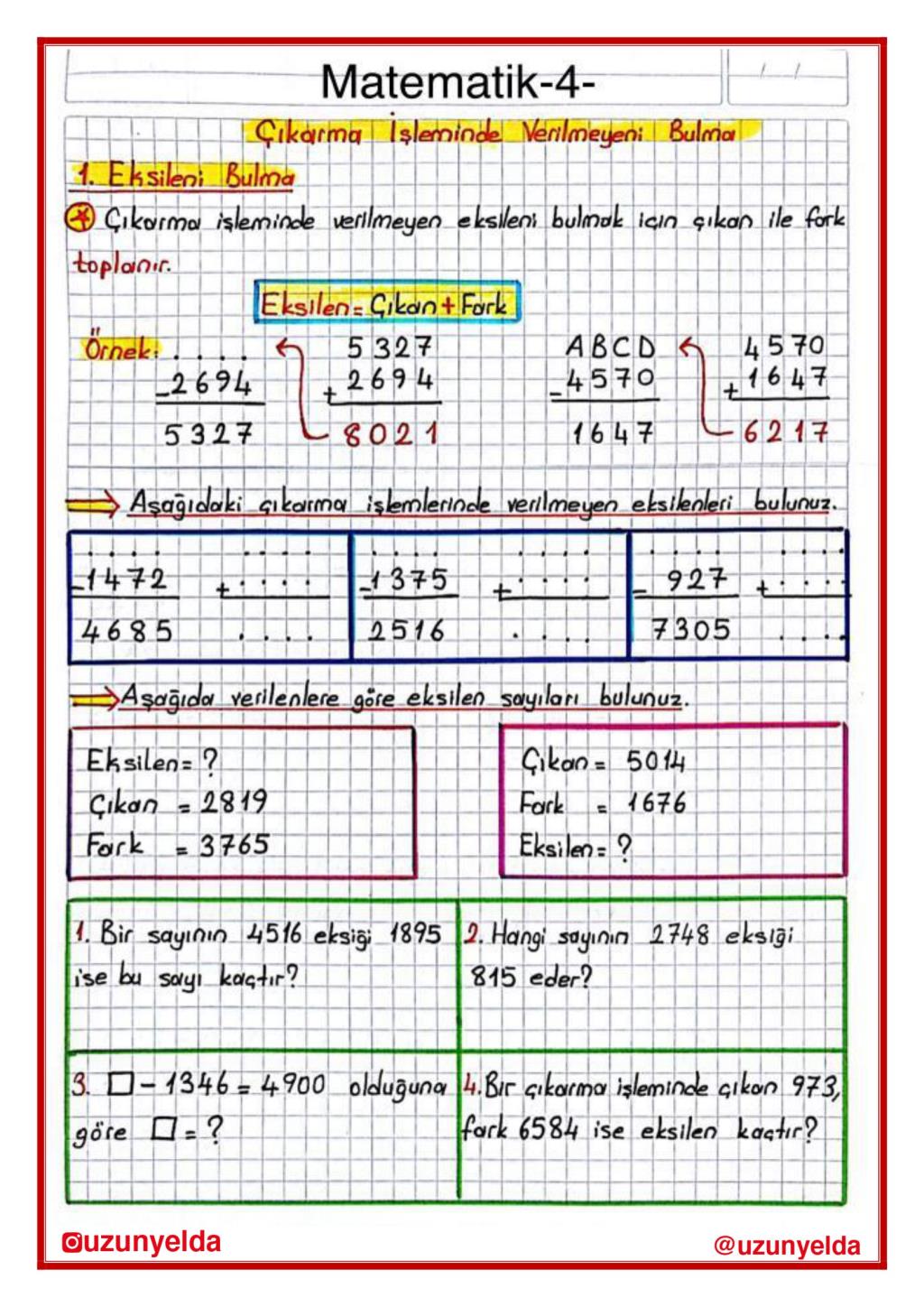 📌Matematik , Verilmeyen Toplananı Bulma,Verilmeyen Rakamı Bulma, Doğal Sayılarla Çıkarma İşlemi