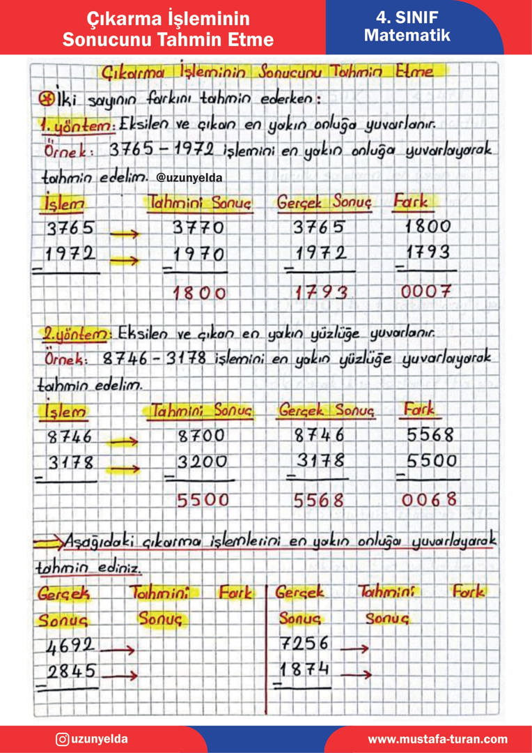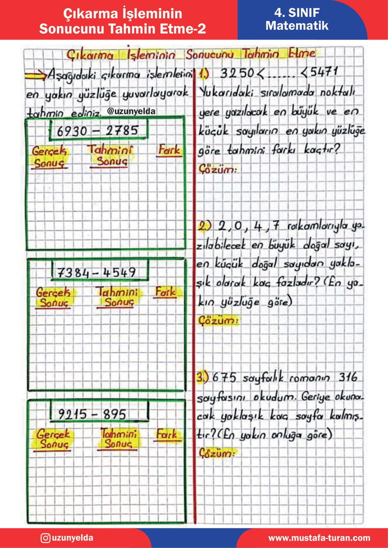 📌Matematik-Toplama İşlemi Problemleri Çıkarma İşleminin Sonucunu Tahmin Etme